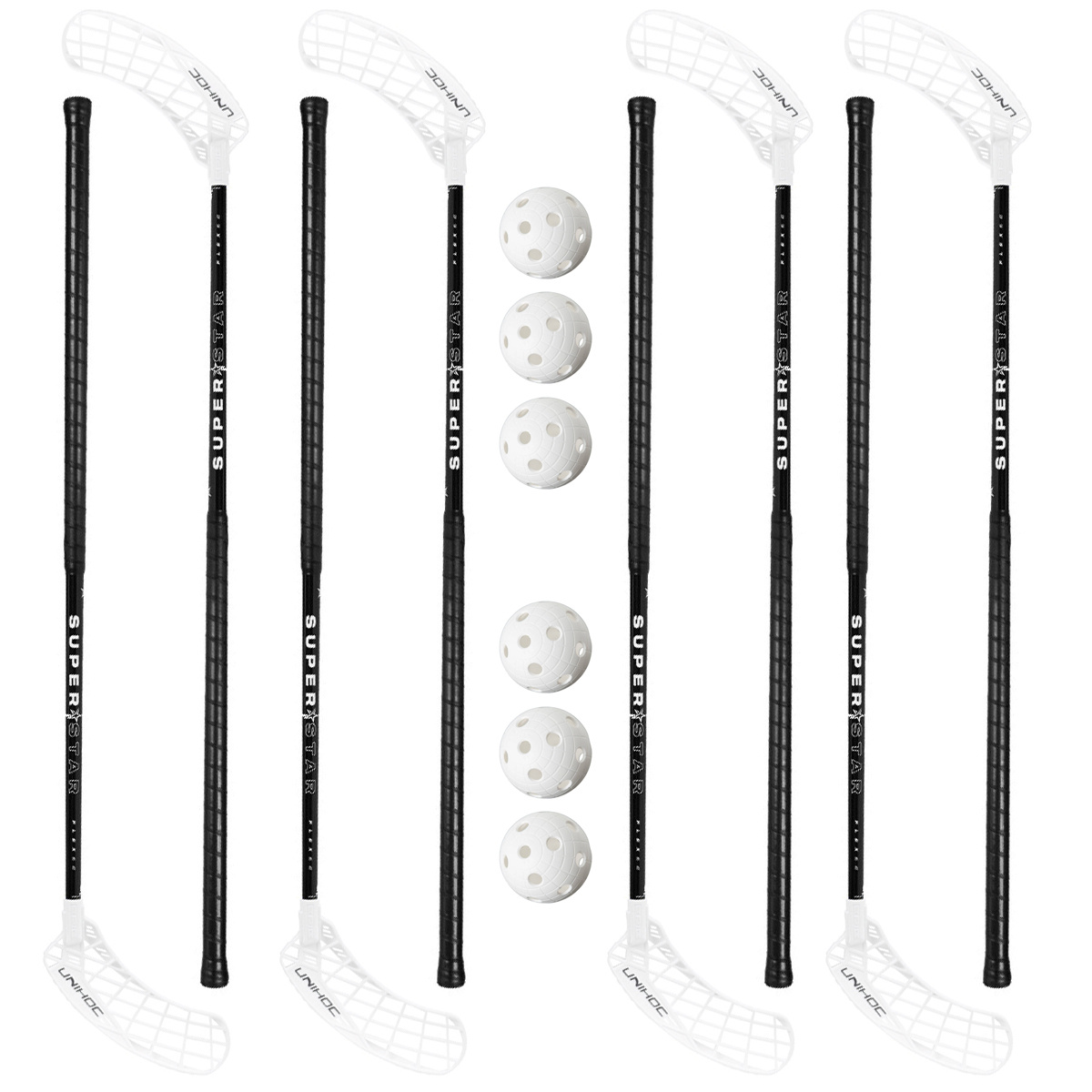 Zestaw zawiera 12 kijów + 6 piłek. SUPERSTAR to kij z niższej półki, wykonany w 100% z włókna szklanego. Kij posiada certyfikat IFF, co pozwala na oficjalne rozgrywki meczowe. Łopatki dobieramy w zależności od dostępności. Jeśli jeden kolor łopatki będzie niedostępny, dobierzemy nowy. Wszystkie zestawy będą dostarczane z tą samą łopatką i kolorem, więc nie będzie żadnych różnic. W zestawie jest 6 piłeczek Unihoc Crater w kolorze białym.